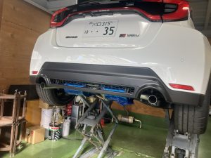 GRヤリス MOTEC M142プラグイン続き、フレックスセンサー取付、配線、配管&ポンプアウトコネクター取付、、後期GRヤリスDAT用サイレンサー付きスポーツキャタライザー@MTは、特注扱い。