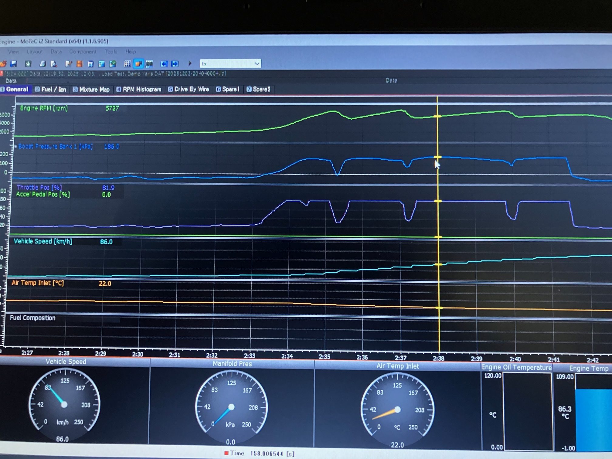 ヤリスのマニュアル、前期と後期は、強化アクチュエーターが良い感じですが、DATに限っては、エディターRとノーマルアクチュエーターが乗り味が良いようです、、スロットル全開のブーストの立上がり、オーバーシュートも強化アクチュエーターが良いのですが、パーシャルからの全開や、ペダルの踏み直した時は、純正アクチュエーターの方がコントロール性(立ち上がりが遅い分マイルド)が良いので、ドライバーは、サーキットを走るならこちらを選ぶでしょう。データー的には、ダイノでログを取ると、ブーストは、2.0k以上掛かっていますが、実走行は、0.15k程低く1.85k位をロギングしています。それと同じ仕様で他社のダイノパックでは、380馬力ほど出ていましたが、なぜか、係数を入れても最近15馬力ほど何処かにお出かけになっているようで、もう、25年も使うとガタが来たのでしょうか、バージョンも古いので何か買え変えたい衝動が出来来ました。。