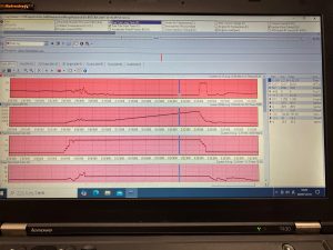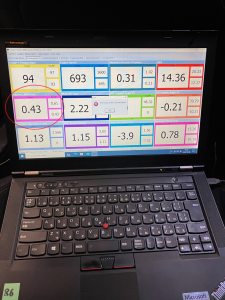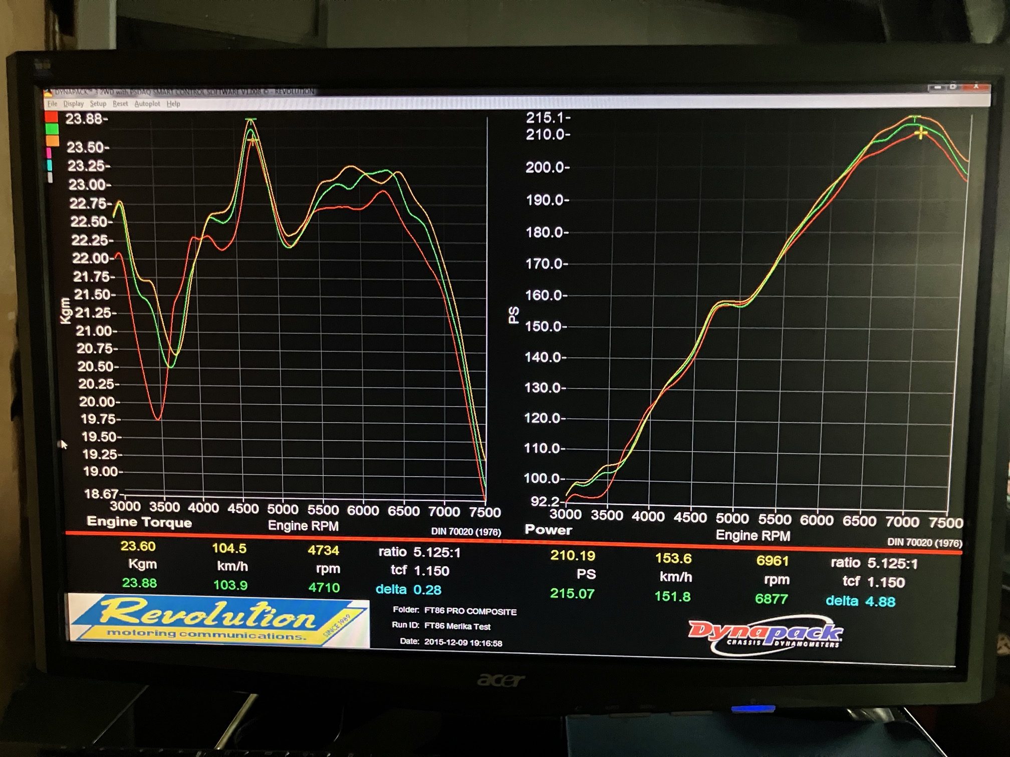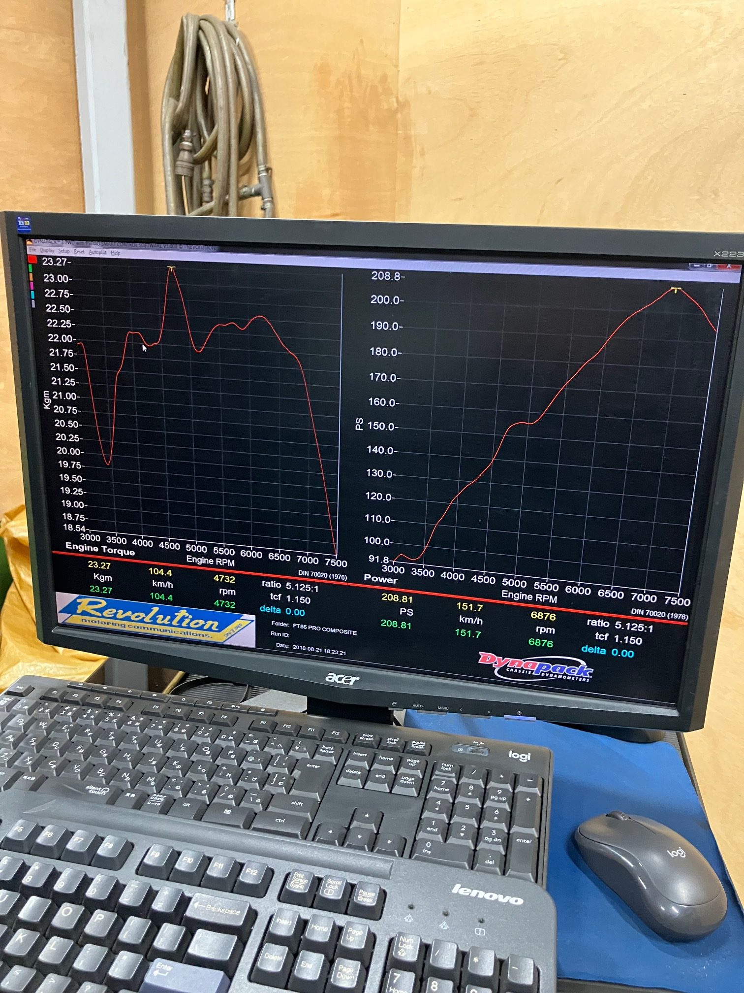 この車両は、約5年程前に前オーナーが一度現車セッティングを弊社で行った車両ですが、現オーナーがサーキット走行中にメタルトラブルで、エンジンブローした後にマイレージが進んだ、エンジンに乗せ換えてからの、現車セッティングでした。まず、GTSでチェックした後にモニターを繋げでみると、アドバンスマルチプライヤーがガタ落ち、、リセットを掛けて、0.7からスタート、、208馬力ですが、トルクカーブが余り良くありません、、、半年前にインジェクターインシュレーターも抜けたようです、、、点火タイミングを1~1.5°程、ピークの当たりを落とすと、ノック補正値が良くなり、アドバンスマルチプライヤーも下がらなくなりましたが、もう少しリタードして、当初より、ピークで2~2.5°下げて、215馬力、トルクカーブも改善しました。少しエンジンがクタビレ気味ですが、まずまずでした。