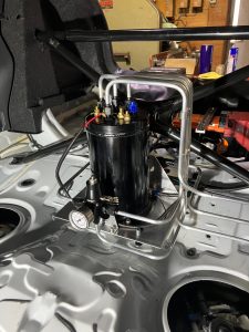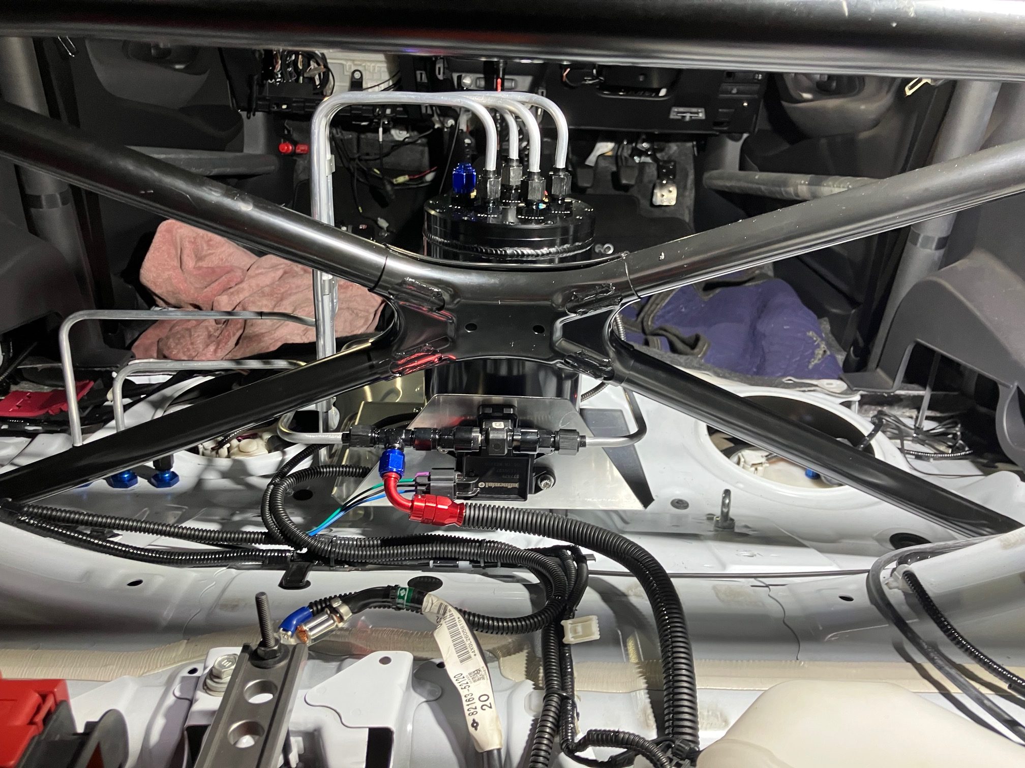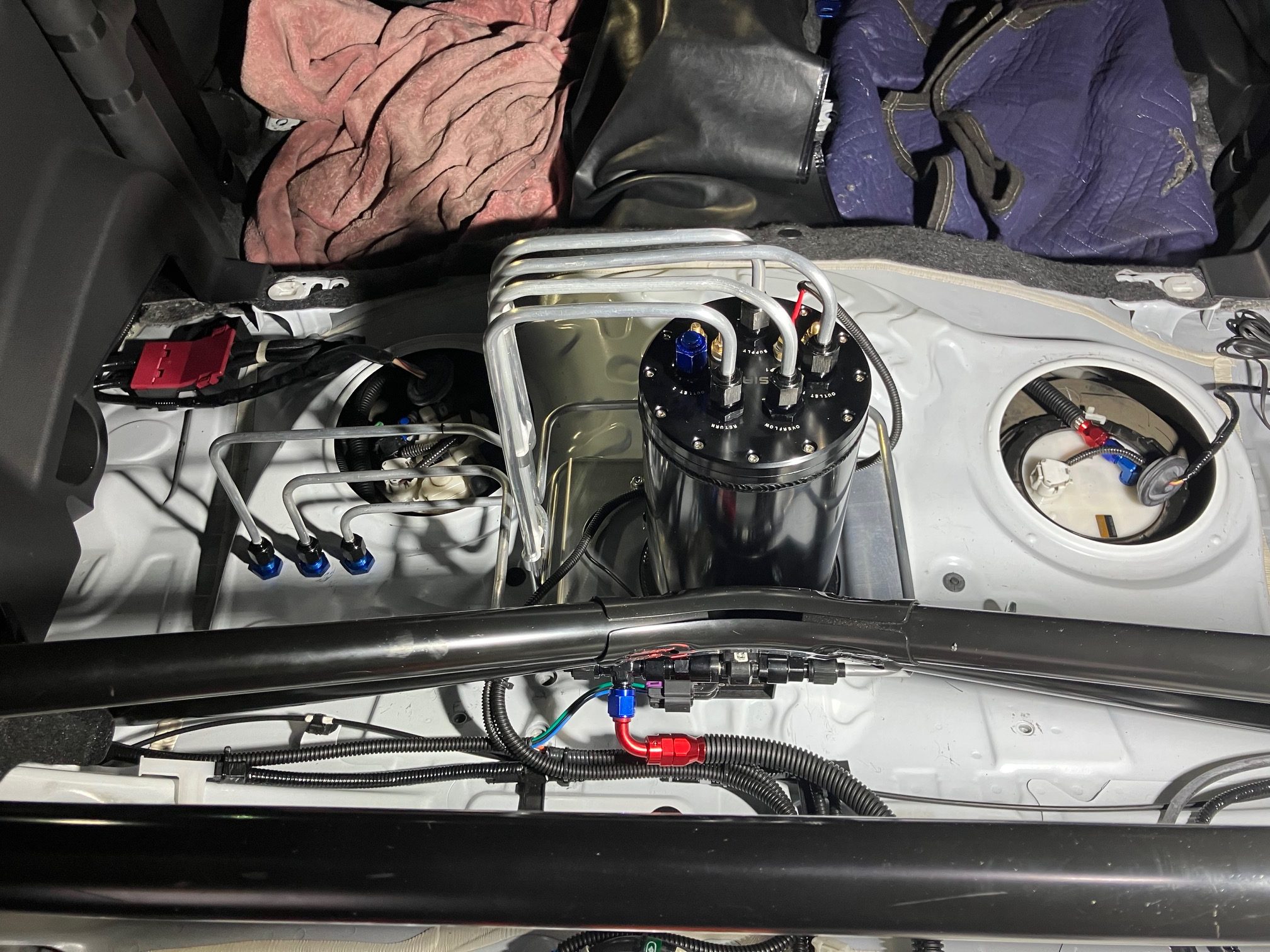 GRヤリス前期のG25+MOTEC仕様の車両ですが、E85エタノール燃料を使える様に、コレクタータンクとフレックスセンサーを取付、燃料タンク内もリターンホースラインを増設して、ポンプアウト用のリグも取付ました、、完成間近です。E85を使える様にすると、点火タイミングやブーストが上げられて、ざっくり50馬力ほど性能が向上します。取付を二人で始めて、今日で4日目です。
