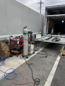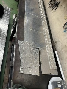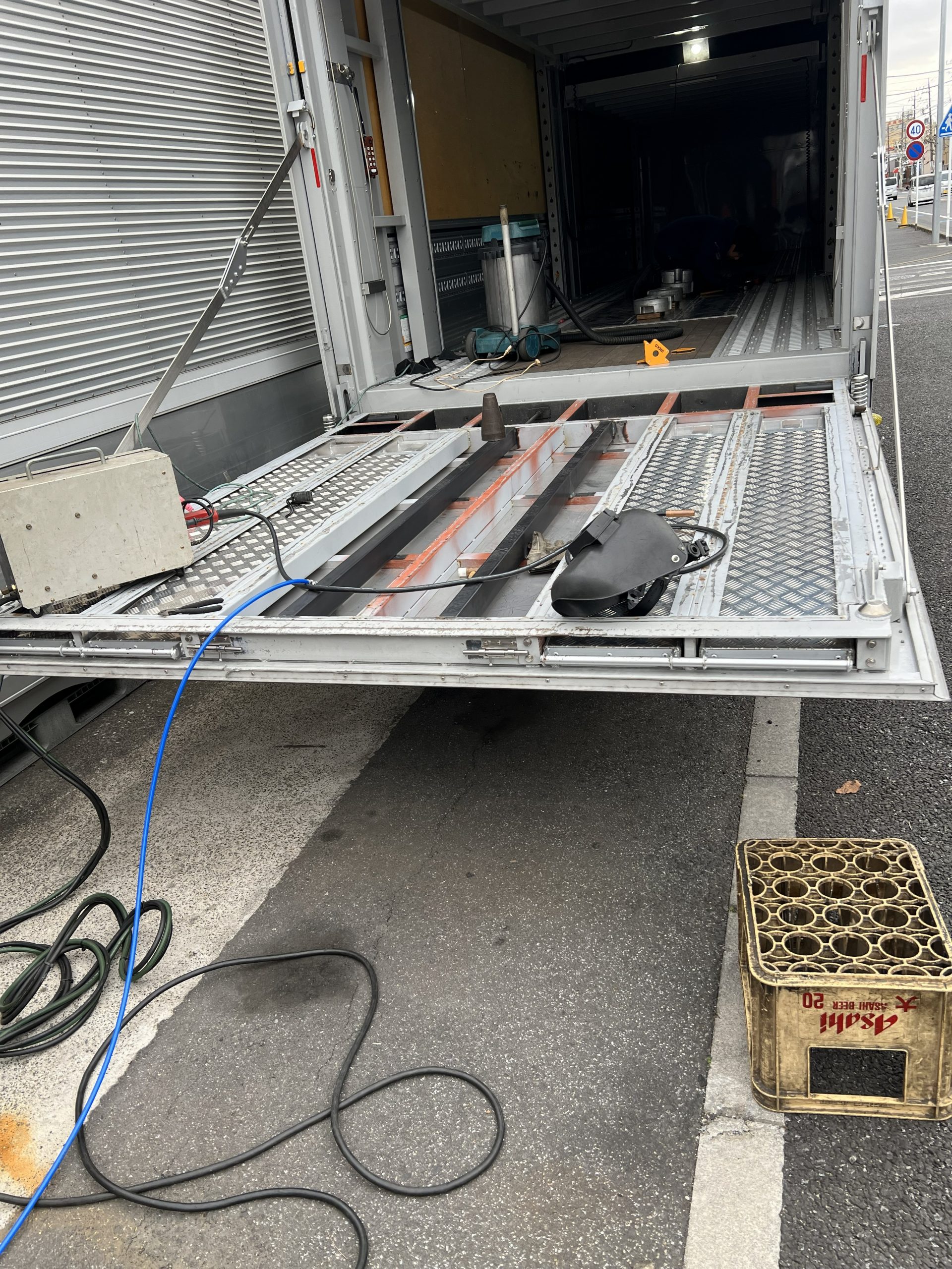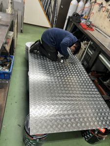 大型トラックで重量級のマシーン搬送、日々使用していたので、パネルが多少のゆがみが出てしまったので、今ついているパネルを剥し、さらなる補強をバーを溶接しながら強化しました。